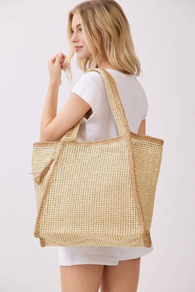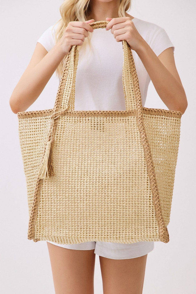Escape to the beach in style with this charming two-tone woven straw tote. Crafted from natural straw with contrasting woven details, it's the perfect companion for sun-soaked days by the water. Spacious enough for all your beach essentials, towels, sunscreen, snacks, and more, while keeping that effortlessly chic vibe. Lightweight and durable, this tote transitions seamlessly from sandy shores to casual outings. Your new go-to bag for making waves this season!